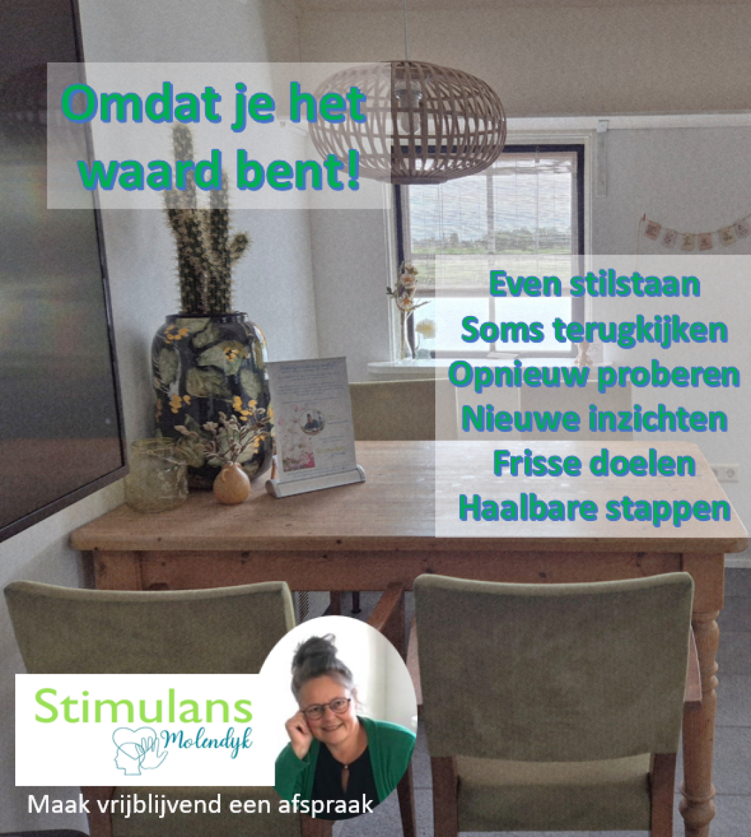 Bewust worden van je gedachten, je gevoelens en je gedrag. Daar willen we op focussen! Onze denkrichting moet veranderen en we mogen kansen oprapen. Vreugde vinden in het structuur aanbrengen. Gestimuleerd worden in het zoeken naar juiste tijdsbesteding en het nastreven van je doelen. Positief tegen uitdagingen aankijken en mogelijkheden zien. Soms ligt de oplossing om het hoekje. Ontdekken dat obstakels slechts hindernissen zijn. Vind jij het moeilijk om contacten te maken? Hoe kom je af van perfectionisme? Voel je je onbegrepen en eenzaam? Hoe ontwikkel je meer veerkracht? Vind je het lastig keuzes te maken? Ben je niet gemotiveerd in je taken? Hoe krijg je een gezonder zelfbeeld? Ben je bang voor veranderingen? Kun je moeilijk nee zeggen? Moeite met prioriteiten stellen? Hoe voorkom je stress? Ik help je graag!